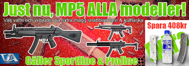 Välj och vraka bland alla MP5 modeller i lager. En med lampa & fast kolv, kanske vill ha ljuddämpare och justerbar kolv? Oavsett vilken modell du väljer skickar vi med Extra magg, snabbladdare och en flaska Frysenkulor! Till ett värde på 408kr Produkterna läggs till i efterhand av oss i när ni handlar i webbshoppen.