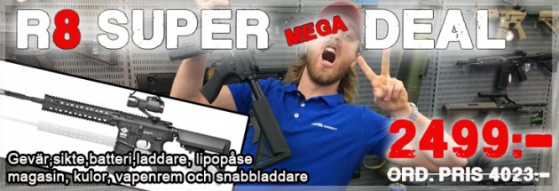 Butiken Frysen Airsoft i Jönköping har skickat in en butiksnyhet om att de just nu har ”R8 Super Mega Deal”;