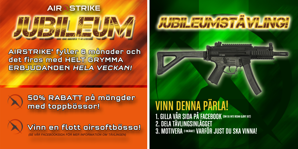 AirStrike firar 6 månader och det firas med grymma jubileumspriser på utvalda airsoftvapen och en tävling där man kan vinna en fin bössa! Tävlingen pågår på vår Facebooksida fram till söndag 3e maj, och vinnare dras på måndag.