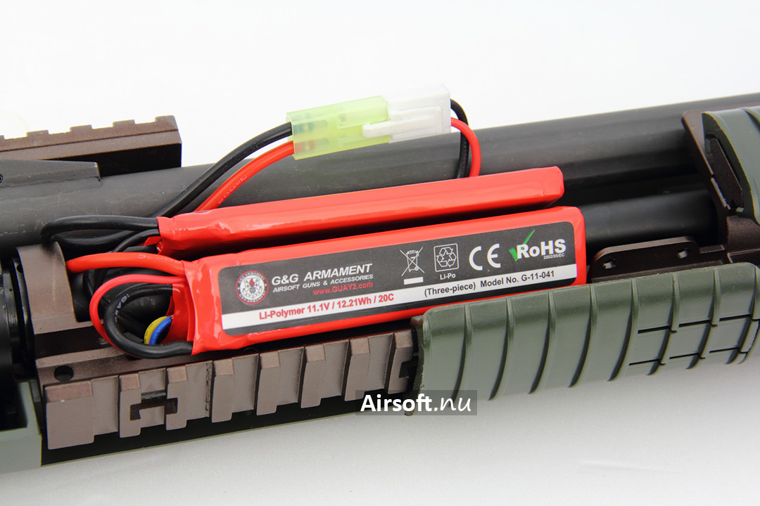 Batterierna i handskyddet på G&G GK5C (AK5C). Batteriet som används här är ett tredelat (Three-piece) 11,1 V Li-po-batteri (12,21 Wh / 20C). Det som används på bilden har produktkoden G-11-041.
