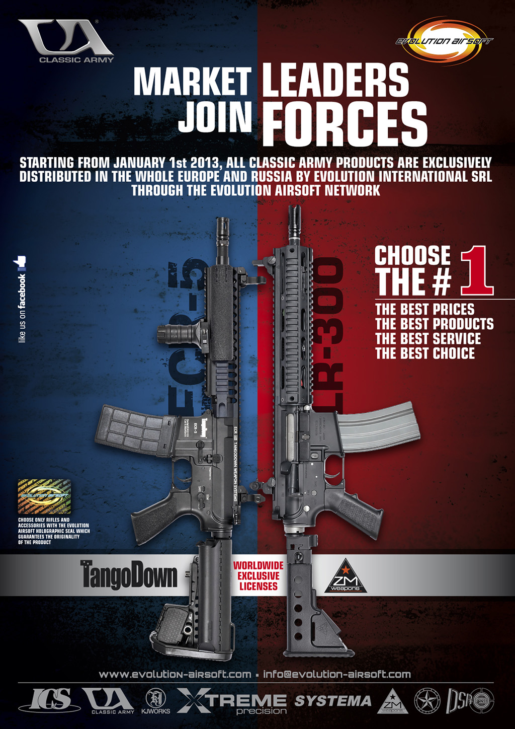 ”Starting from January 1st, 2013 the whole range of Classic Army guns, accessories and tactical equipment is distributed by Evolution International S.r.l. under exclusive agreement in the European continent, including the European Union, the non-EU member countries, and Russia.