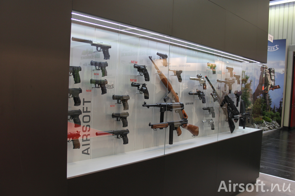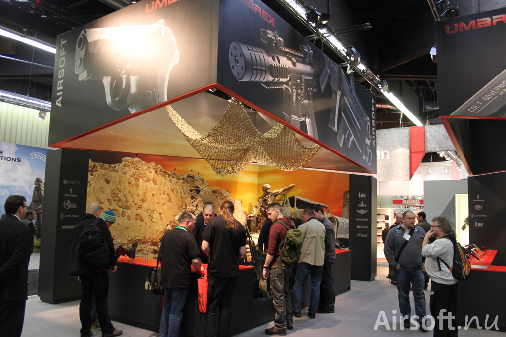 Umarex airsoftavdelning.Företaget Umarex hade den till ytan största montern på IWA 2014 och i airsofthörnet visade de upp en hel del nyheter med licenser från framför allt Heckler & Koch och Walther.