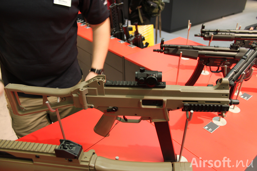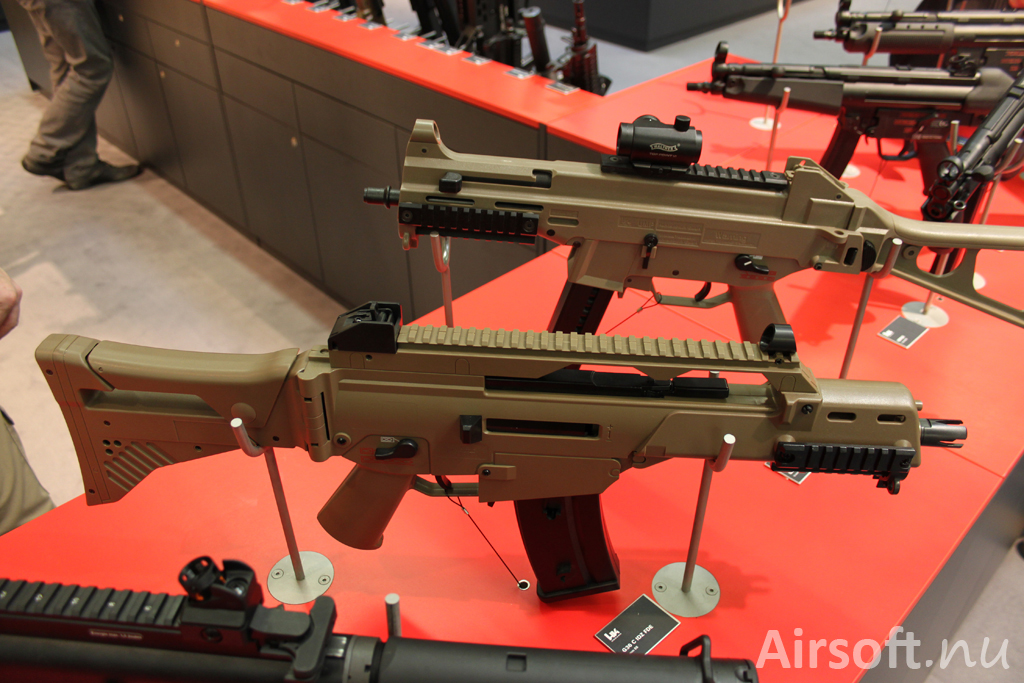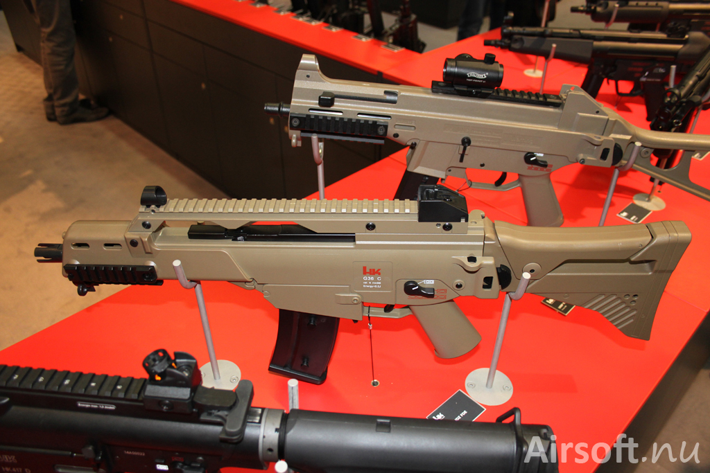 H&K G36 C IDZ.Batteridrivna G36C-vapnena med blowback G36 C IDZ i svart (2.6300) och sandfärgad (2.6301) kommer lanseras i maj. Bakom finns UMP-vapnet UMP FDE Sportsline som är batteridriven och lanserades nyligen. FDE står för Flat Dark Earth.