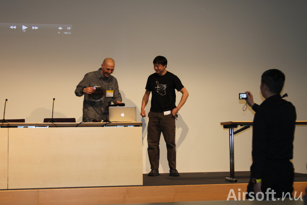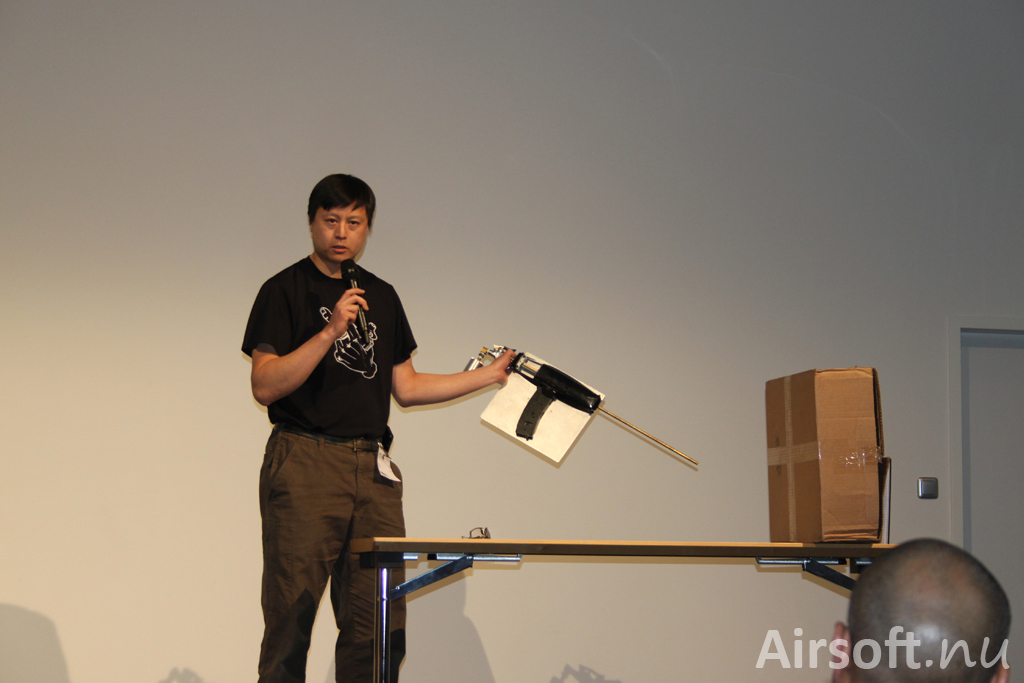 Airsoft Innovations. Visar prototypen av deras gasdrivna airsoftvapen som på en laddning skjuter flertalet kulor igenom samma ingångshål. Första gången visad på Shot Show i ett hotellrum.
