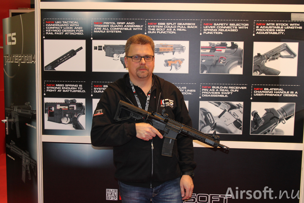 I tillverkaren ICS monter fanns Jonas från butiken JBB Guns och som sedan några år tillbaka brukar jobba i deras monter på IWA. Årets huvudnyhet var airsoftvapnet TRANSFORM4 som är ICS första vapen med elektrisk blowback. Kolla in videon där Jonas berättar mer om vapnet och dess funktioner.