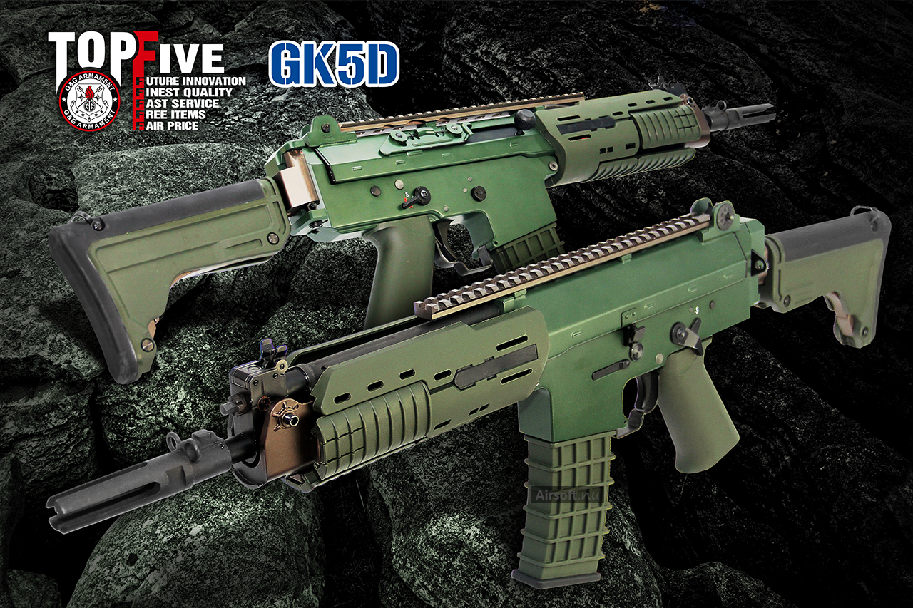När det gäller batteri så ska ett 7.2 V LiPo-batteri få plats i handskyddet till skillnad från ett 11.1 V 3-delat LiPo som får plats i GK5C. Utöver kortare inner- och ytterpipa och handskydd så ska allt annat vara identiskt med AK5C (GK5C GL).