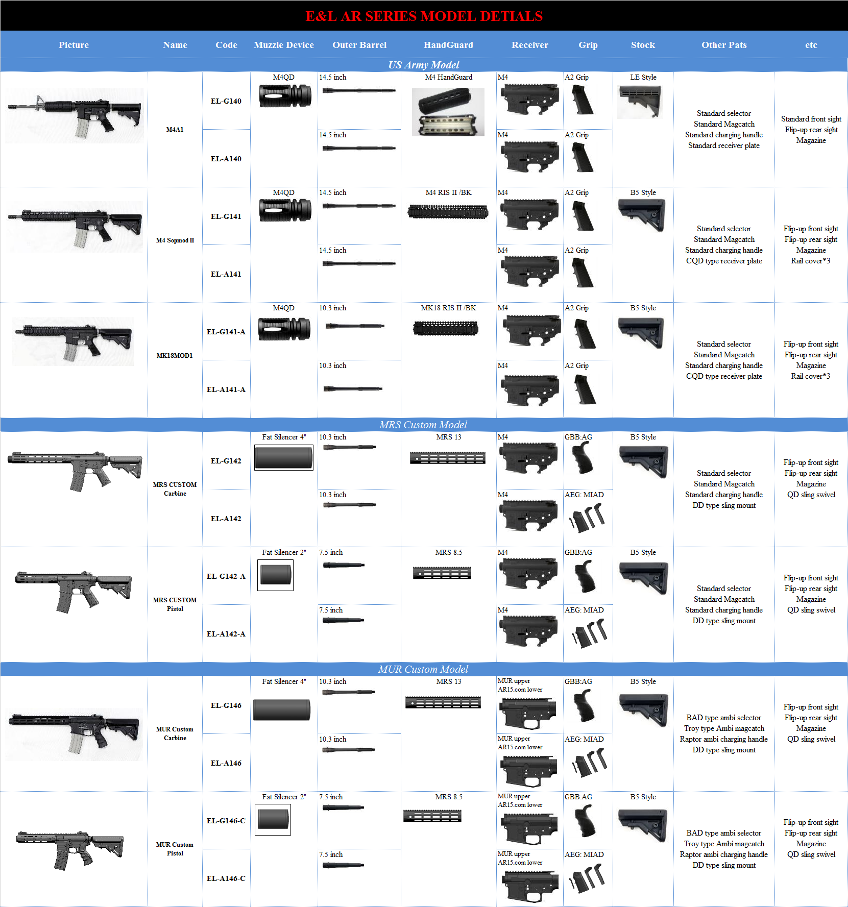 Tillverkaren E&L Airsoft (Emei & LandArms Airsoft) som mest är kända för sina AK-modeller har även börjat med AR-modeller (M4) sen ett tag tillbaka och de lanseras i batteri- respektive gasdrivna varianter.