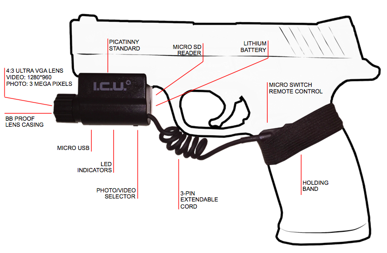 Företaget Plan Beta i Hong Kong har nyligen lanserat vapenkameran I.C.U. [Integrated Camcorder Unit] och kan fästas på picatinny-skena.