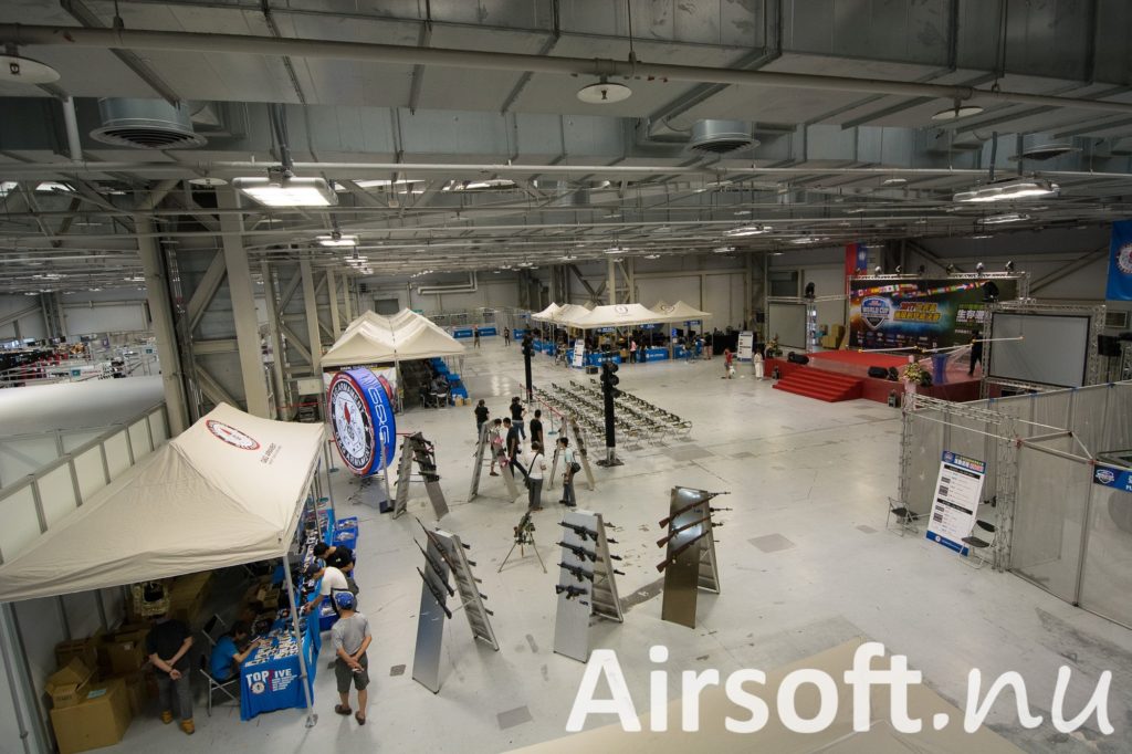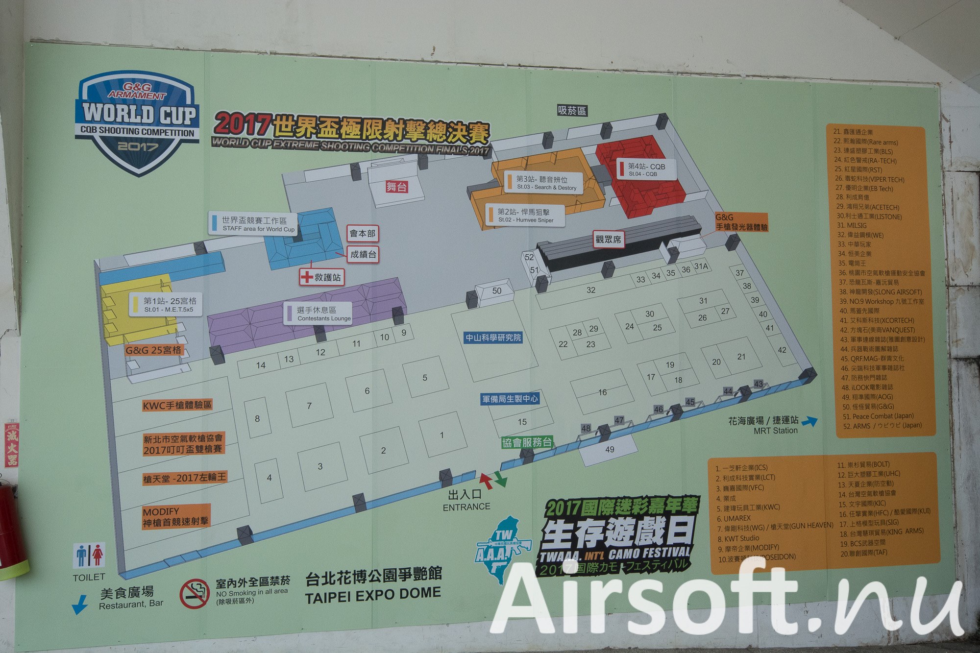 Mässhallen var uppdelad i två delar där mässan TWAAA Int’l Camo Festival hade ena halvan där tillverkare och butiker hade egna montrar. I den andra delen fanns scenen och allt relaterat G&G World Cup 2017-finalen. På vänstra kortsidan (enligt bilden ovan) var det olika skjutbanor där några var för besökare och några för tävlingsdeltagare (G&G World Cup). Bland annat hade tillverkaren Modify en tävling där det gick att vinna snipergeväret Novritsch SSG24.