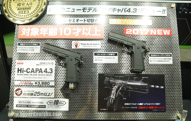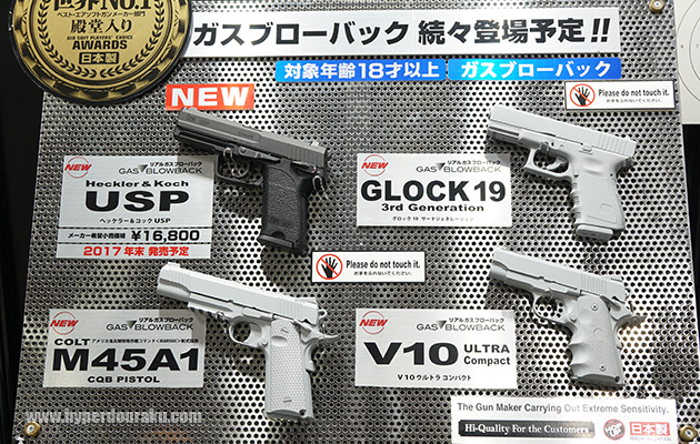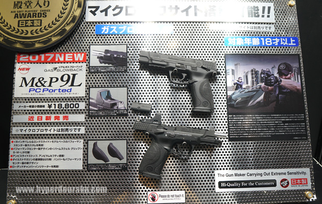 Pistoler som visades upp var Marui Hi-Capa 4.3 AEP, M&P 9L PC Ported (GBB) och USP (GBB) tillsammans med flera prototyper och tillbehör.