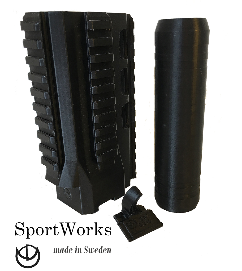 Produkterna är FDM/3d printade. Där produkten har behövt stöd under utskrift finns märken från ”supports”. Designen är sådan att dessa områden är begränsade till utrymmen mellan ”rail-ribbor” och en liten del av de portade områdena. Dämparen är konstruerad så att ”Skarven” hamnar under nedåt efter montering tillsammans med SportWorks Handguard.