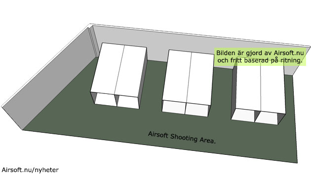 Enligt ritningen finns det sex stycken skjutbanor och där varje skjutbana är 40 m² (enligt information i ritningen). Bilden ovan är gjord av Airsoft.nu, fritt baserad på ritningen.