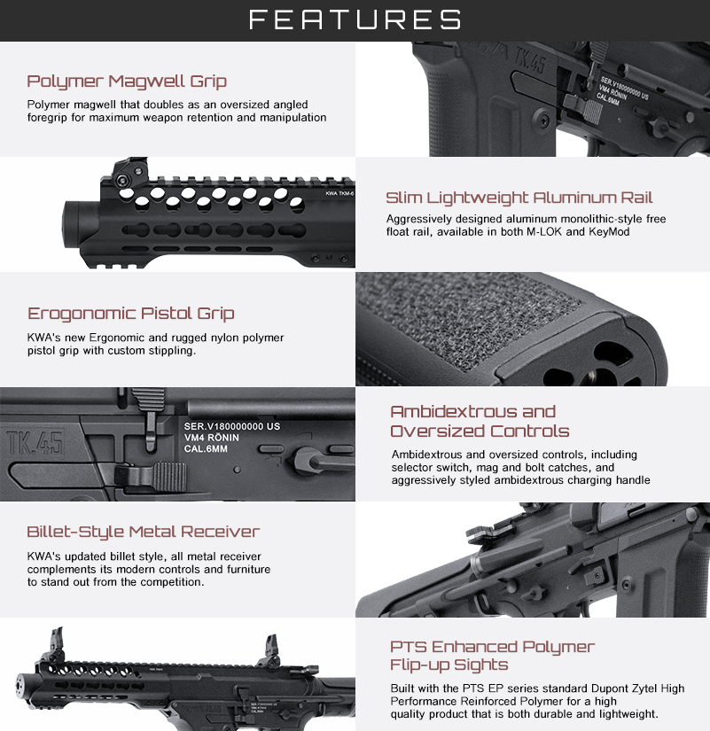 TK.45C är vad KWA kallar AEG 2.5 och har bland annat vad de kallar VPS (variable performance system), dvs det är möjligt att justera utgångshastigheten. Denna modell har också keymod-gränssnitt i handskyddet.