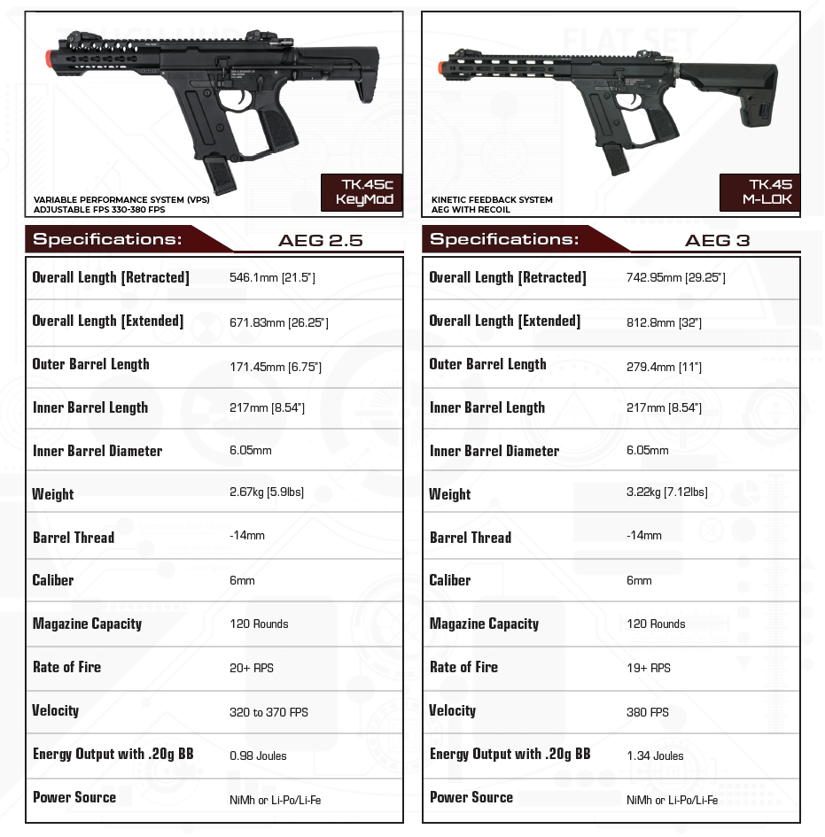 TK.45 däremot är AEG 3 och har ett rekylsystem i axelstödet (kinetic feedback system AEG with recoil) men inte samma system som TK.45C med justerbar utgångshastighet. Denna modell har M-Lok-gränssnitt i handskyddet.